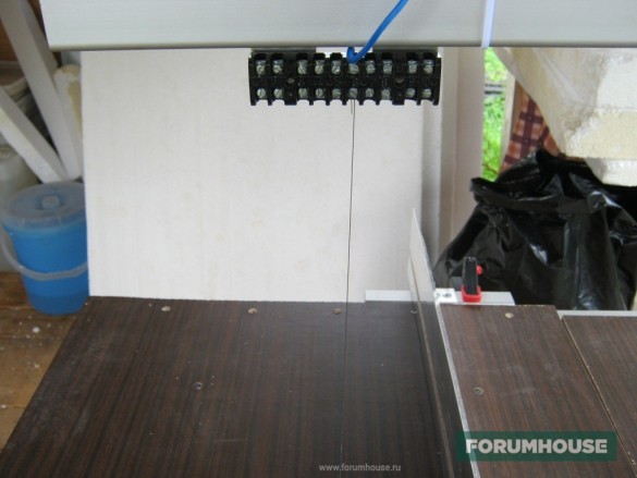 Станок для резки ППС пользователь сделал так — пропустил нихромовую нить через отверстие в столе. Нить проходит через керамическую панельку от радиолампы. Для натяжения проволоки Электрон взял шпильку М10 с гайками. С одного края он сточил лыски и просверлил поперечное отверстие. В него продел пружину. Конец пружины он зажал в полиэтиленовый латунный клеммник. Во второй конец клеммы зажал струну и питающий провод. Это нужно, чтобы ток не шел через пружину, и она не потеряла пружинистые свойства. После подачи напряжения, натяжение нихромовой нити регулируется с помощью шпильки.