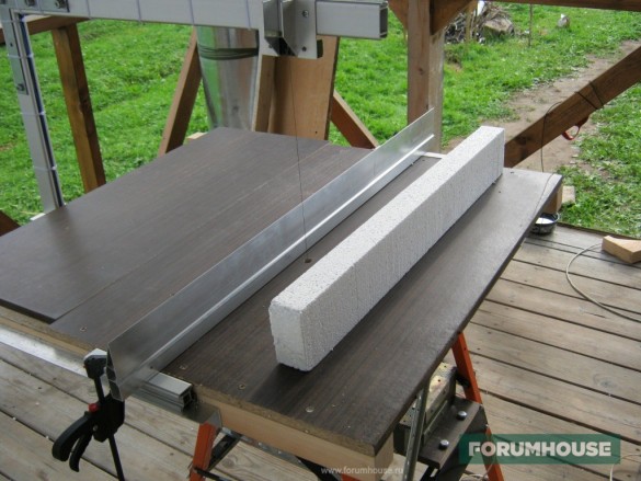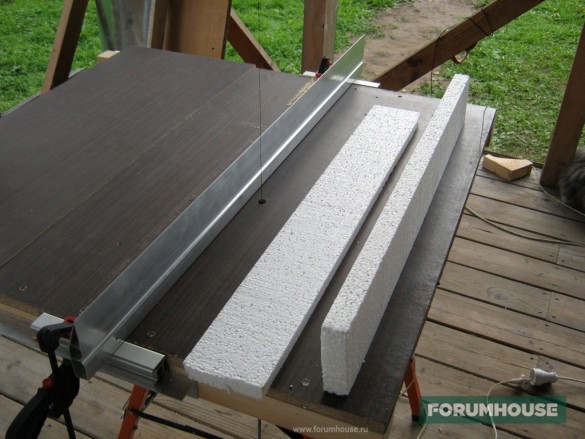 На фасадах мы работает с мобильными «козами». С ними легко перемещаться по лесам на высоте. Можно резать пенопласт прямо по месту. Роспуск листа то толщине ведём по двум профилям. Профиля крепятся к ППС с помощью гвоздей. Как работать с приспособой наглядно видно на видео ниже.