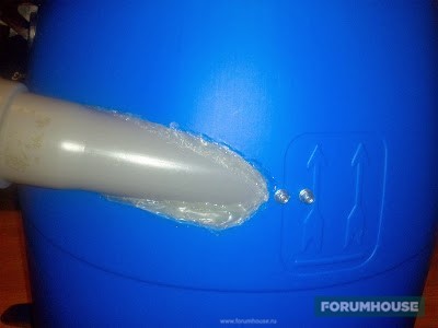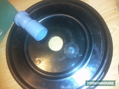 - В крышке пользователь вырезал отверстие для переходника. Вставил трубу и проклеил стыки термопистолетом.