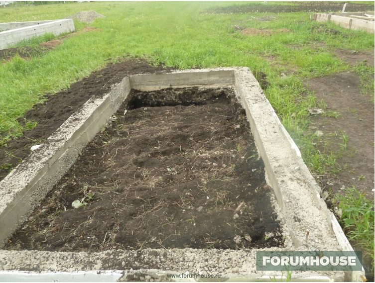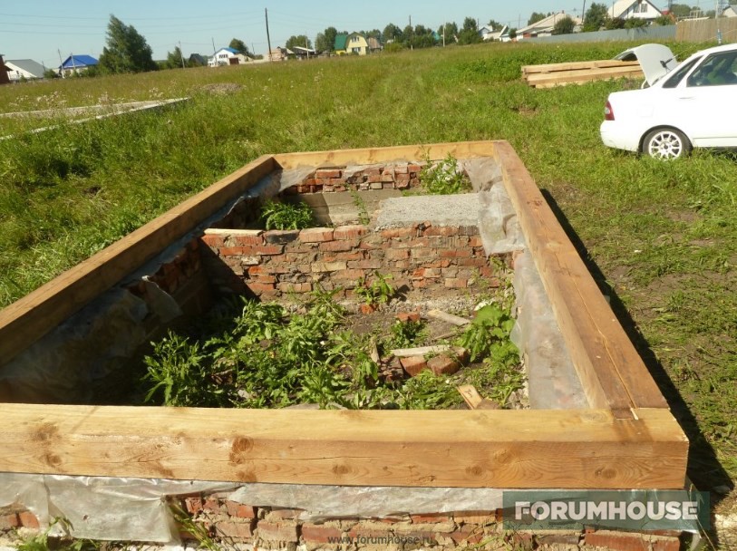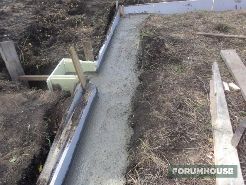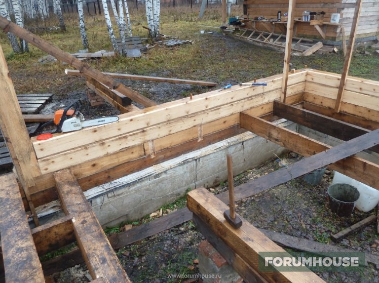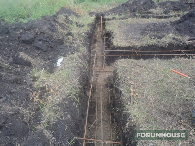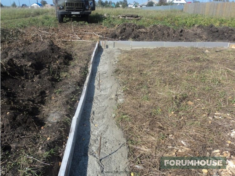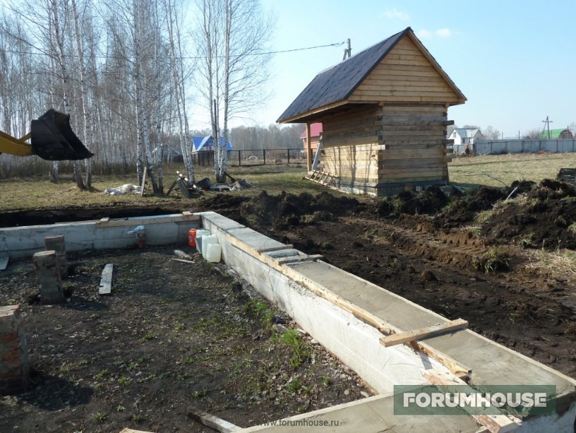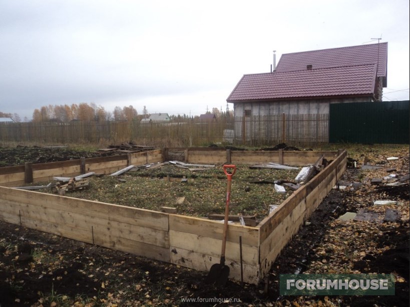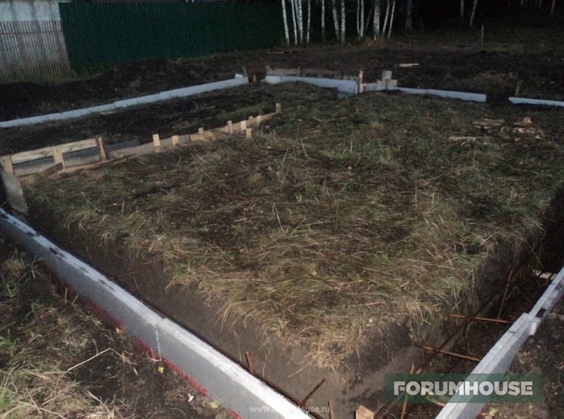 Отступлением от стандартной технологии заливки МЗФЛ стало частичное бетонирование – не было денег на весь объем, заканчивался сезон, поэтому сначала залили только по уровень грунта, а для связки этой части с верхней в бетон воткнули пруты арматуры. Но тут ситуация несколько поменялась к лучшему и монолитному цоколю быть – выкопал картошку, собрал опалубку, установил арматурный каркас. Так как уже подмораживало, бетон заказал с противоморозными добавками и залился. Остатки бетона слили в траншею фундамента под будущую бытовку-баню и на этом первый сезон закрыли.