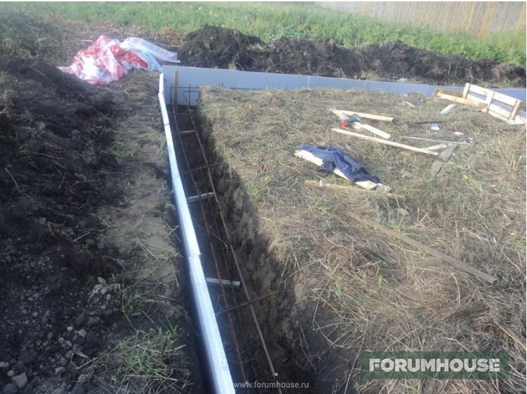 На момент начала сборки арматурного каркаса на участке не было даже электричества – металл пилил ножовкой, шуруповерт заряжал генератором. Но такими темпами дело двигалось медленно, поэтому пока электрики осваивали документы, выдавали ТУ и подключали, обратился за помощью к соседу. Протянутый им к границе удлинитель очень облегчил сезон 2015 года, а там и собственное электричество появилось, и процесс пошел веселее. Вместо деревянной опалубки в траншею по внешней границе уложил нарезанные листы ЭППС, заодно и утеплил.