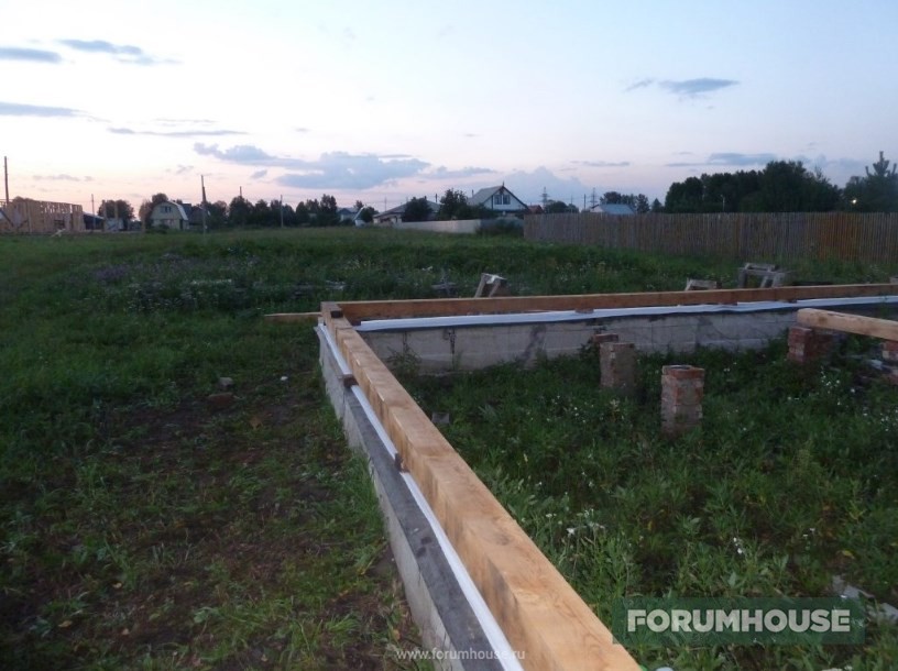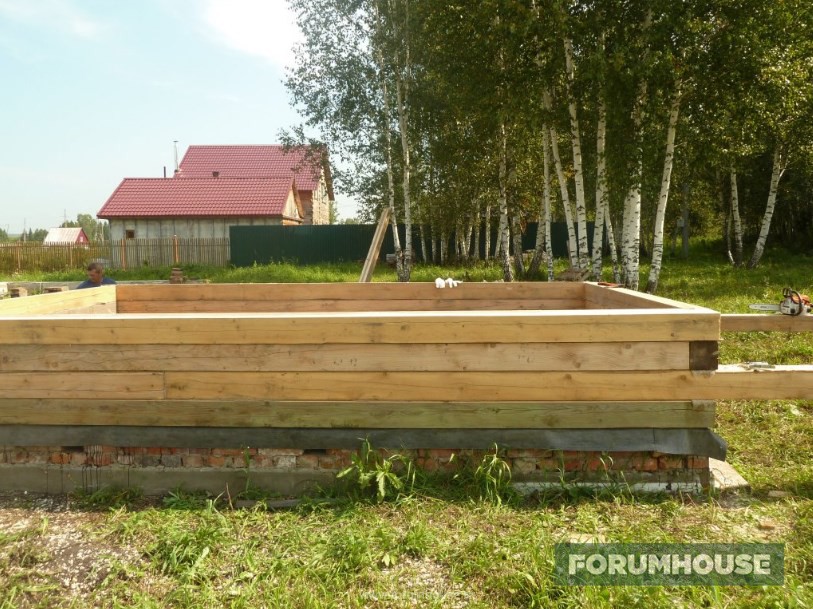 Но стройка все же началась, как оно и должно быть – с гидроизоляции ленты мастикой с последующей укладкой рулонного материала. Выровнять первый венец помогли такие же самостройщики, уже закончившие свои брусовые дома.