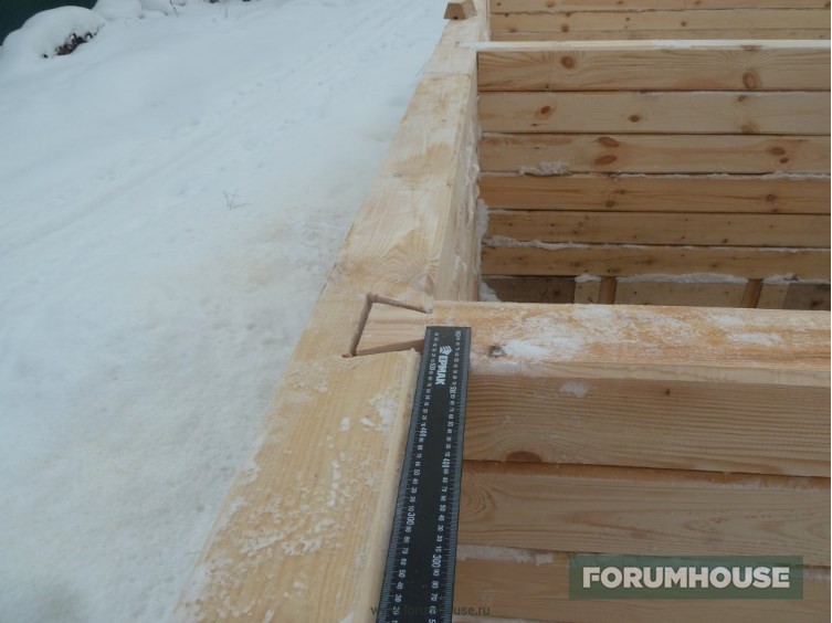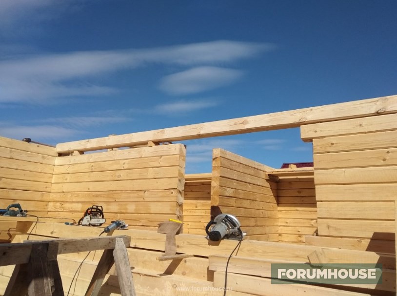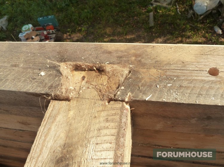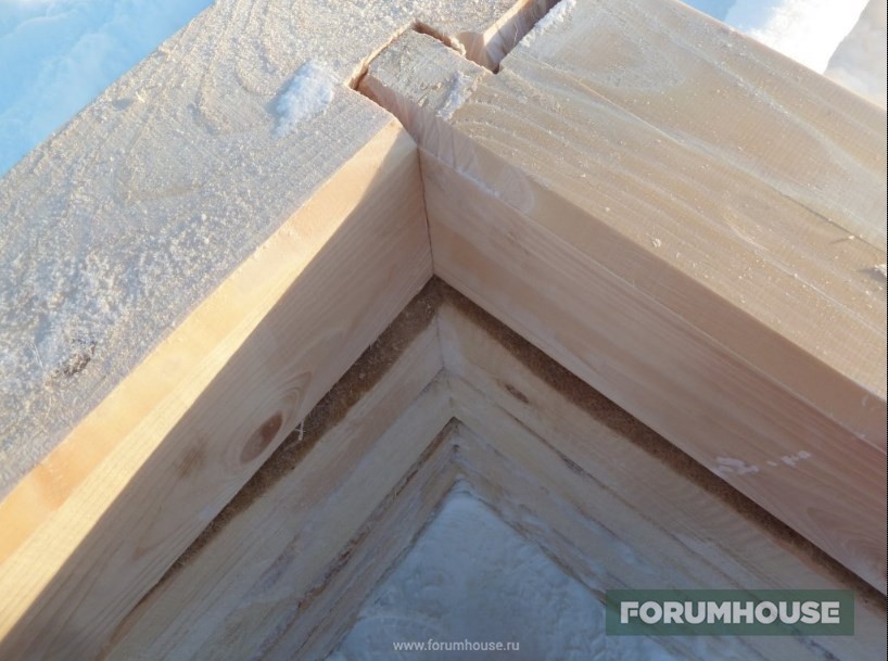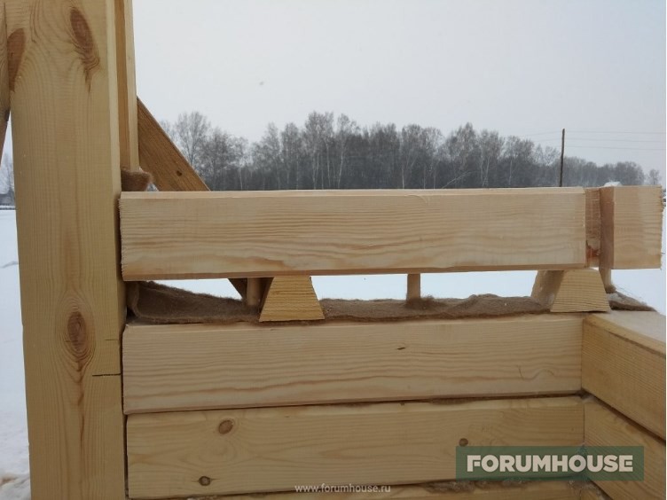 Технология вся та же – разметили, просверлили, установили шканты, накинули паклю, насадили на шканты сверху брус. Все уже доведено до автоматизма, получается быстро. Кстати, на втором этаже во всех торцах пазы под ройки пропиливаю сразу. Так мне удобнее, чем паз прям по месту пилить. В одном месте только не сделал – но в одном это в одном, не так страшно.
