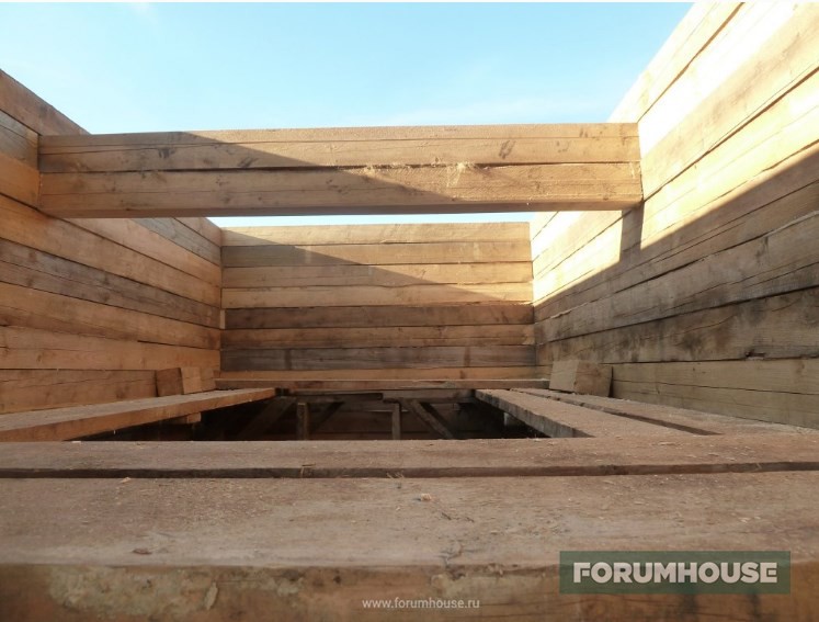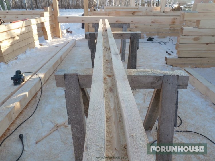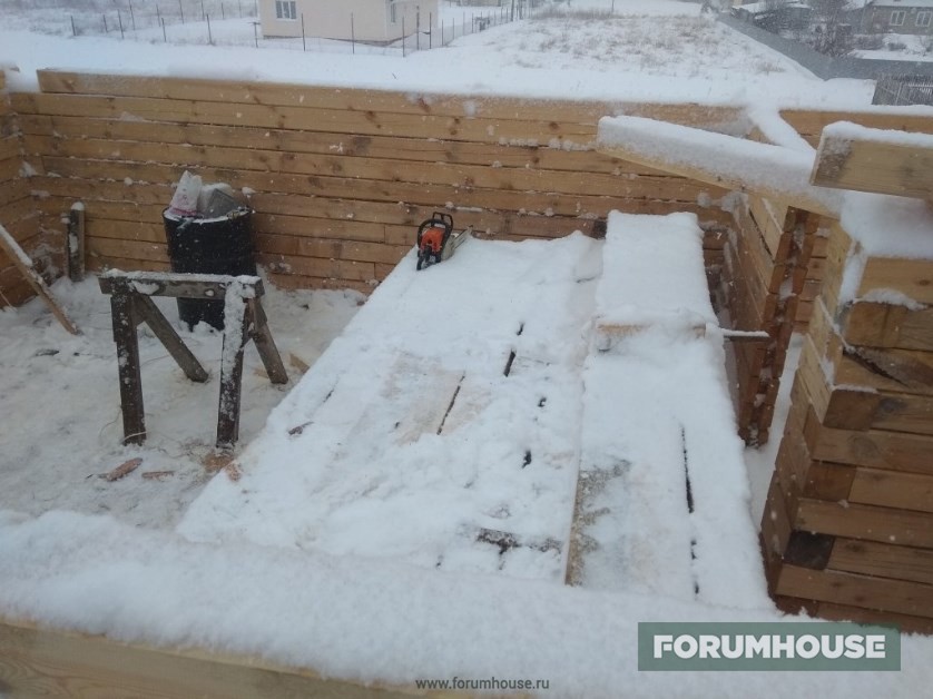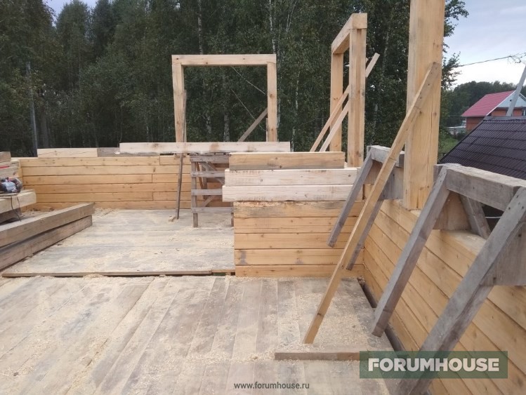 Второй этаж. Первые ряды из пихты, дальше, опять сосна. Пиломатериал уже приходится поднимать краном и складировать на перекрытии, неплохая проверка на прочность.