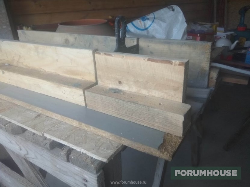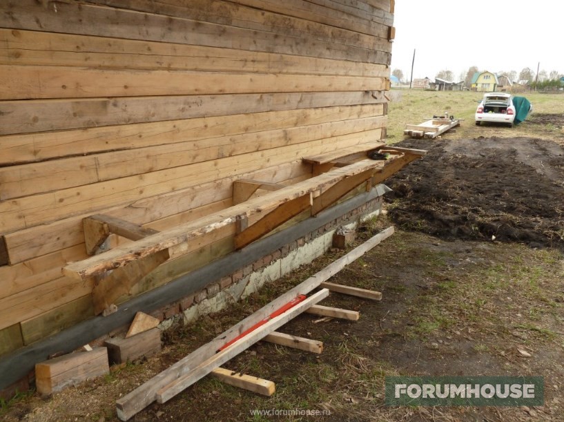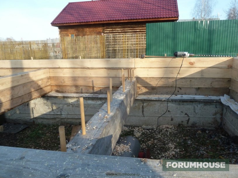 Но на это продолжение так сразу финансов не нашлось, и умелец занялся «доводкой» отложенного на потом: долил столбики под перегородку в местах стыка, предварительно вывесив брус на домкраты.