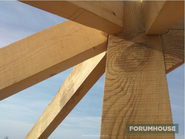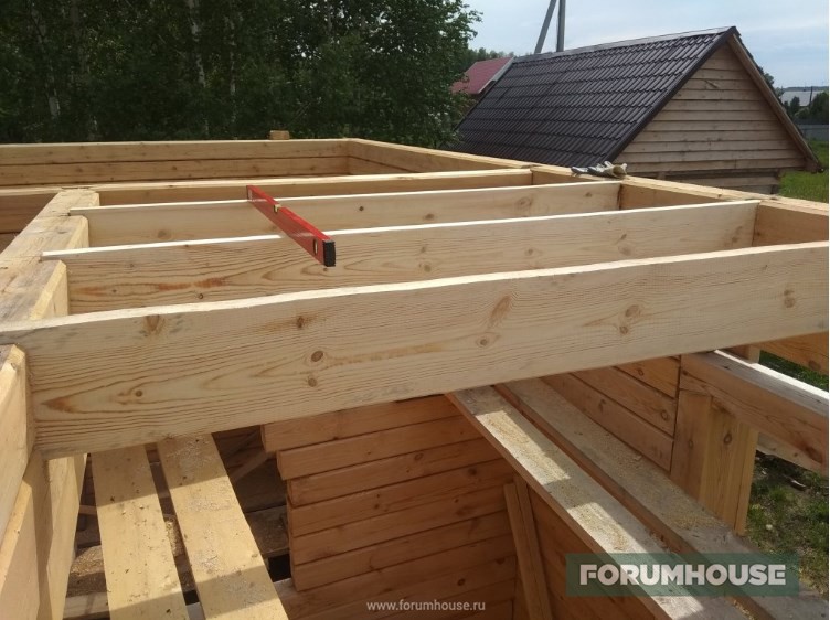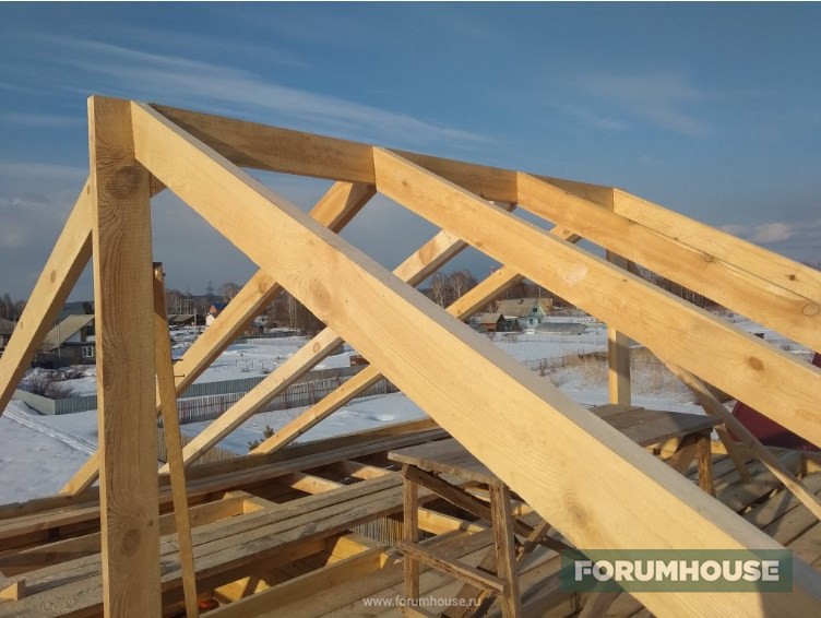 Крыша задумана вальмовая. Вальмовая, потому что дом в два этажа, а ветры у нас там иногда, в апреле/мае дуют прямо неслабые. Вальмовая конструкция лучше противостоит ветру, так как нет фронтонов. Проект на крышу делать не стал – подумал, что мне проще тригонометрию обратно вспомнить. Благо площадь дома небольшая – сложностей особо не предвиделось. Но надо решить два вопроса – длина дома 9 метров и такого пиломатериала нет. Значит надо изготовить длинную составную балку, лежень, на которую будет опираться конструкция крыши. Ну как конструкция – на ней будут стойки стоять, на которых конек будет крепиться. Потом второй вопрос – какой делать высоту крыши. Допустимый градус уклона под нашу снеговую нагрузку вычислялся уже при высоте конька 2 метра. Но два метра казалось очень мало. Было решено определять высоту конька визуально. Так сказать, провести на месте лабораторную работу.