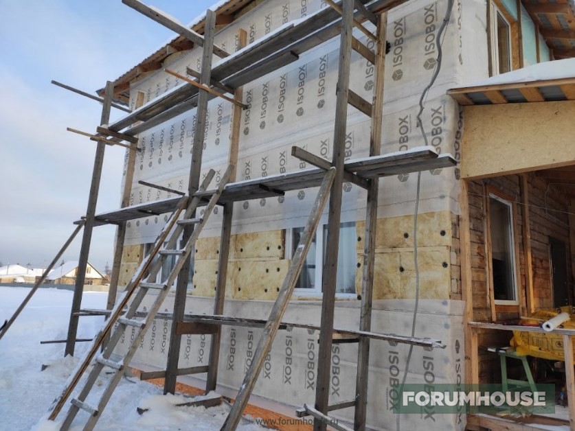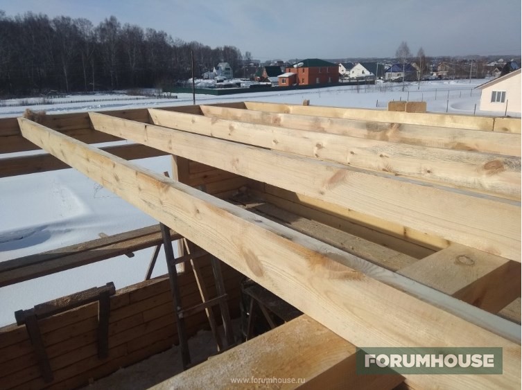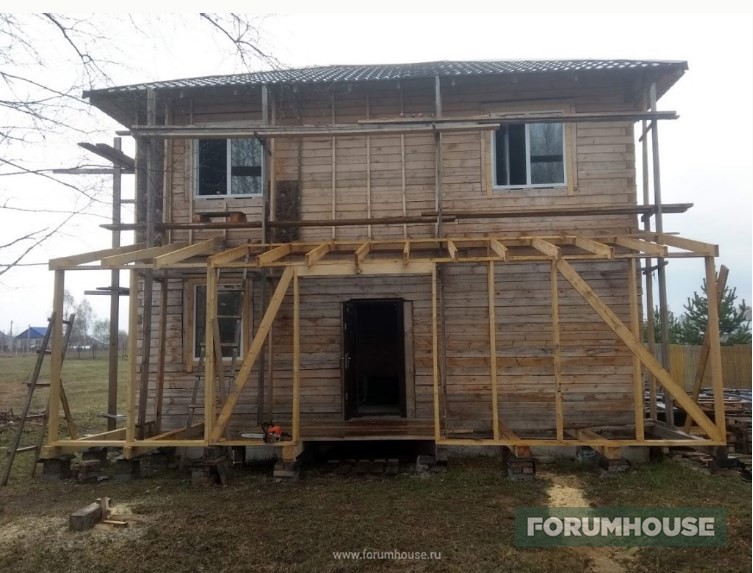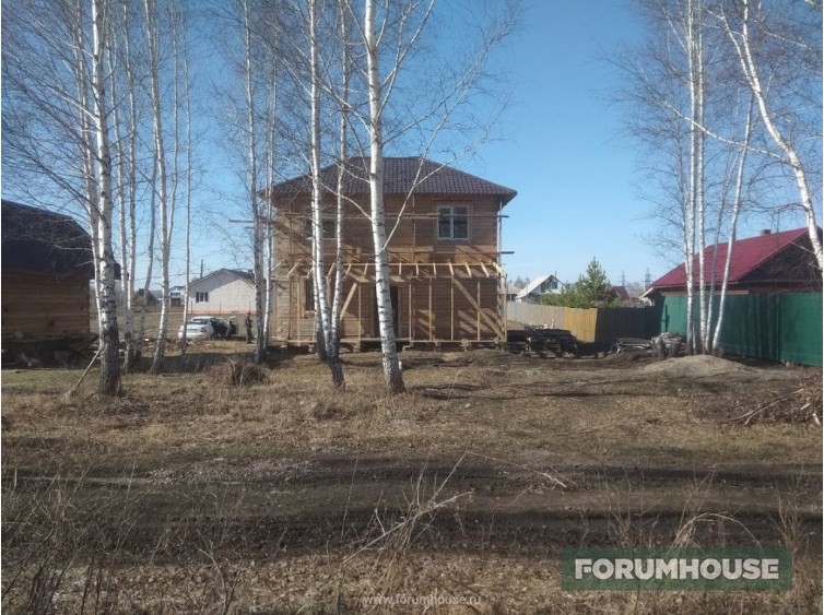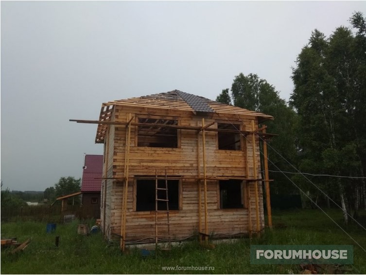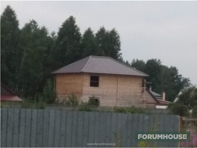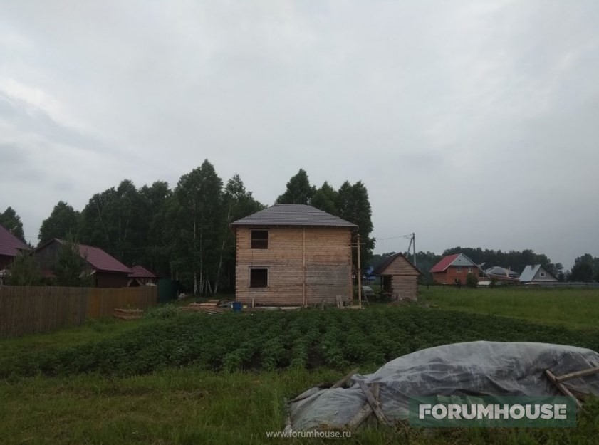 Дом в два этажа с полноценным холодным чердаком, около 130 квадратов площадью, на момент старта темы находился на этапе монтажа крыши.