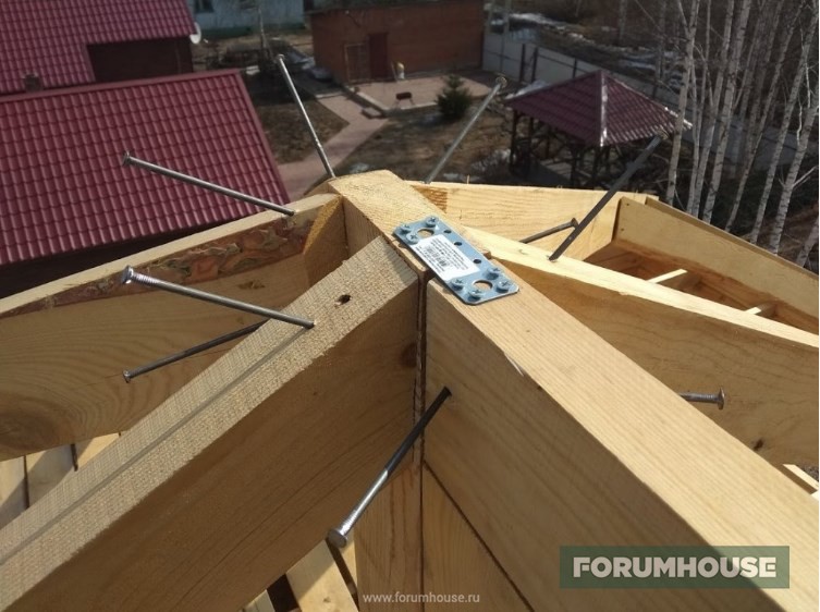 Ветра в наших краях по весне бывают нешуточные – вполне себе ураганы, особенно в мае, поэтому каркас крыши укрепляем на совесть – раскосы, укосы, подпорки, ну и металлические пластины на серебристые саморезы везде, где можно, от души. Стропильные ноги прибивались к подстропильной доске с предварительным засверливанием 200-ми гвоздями.