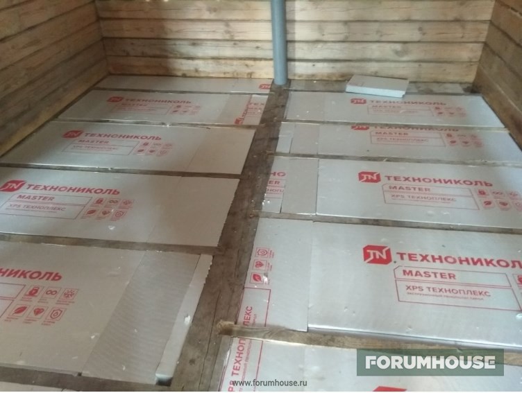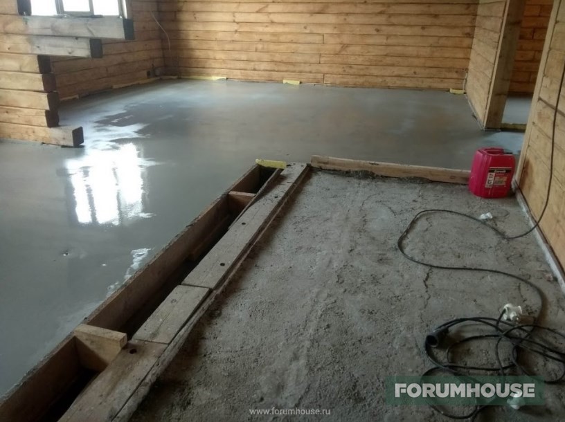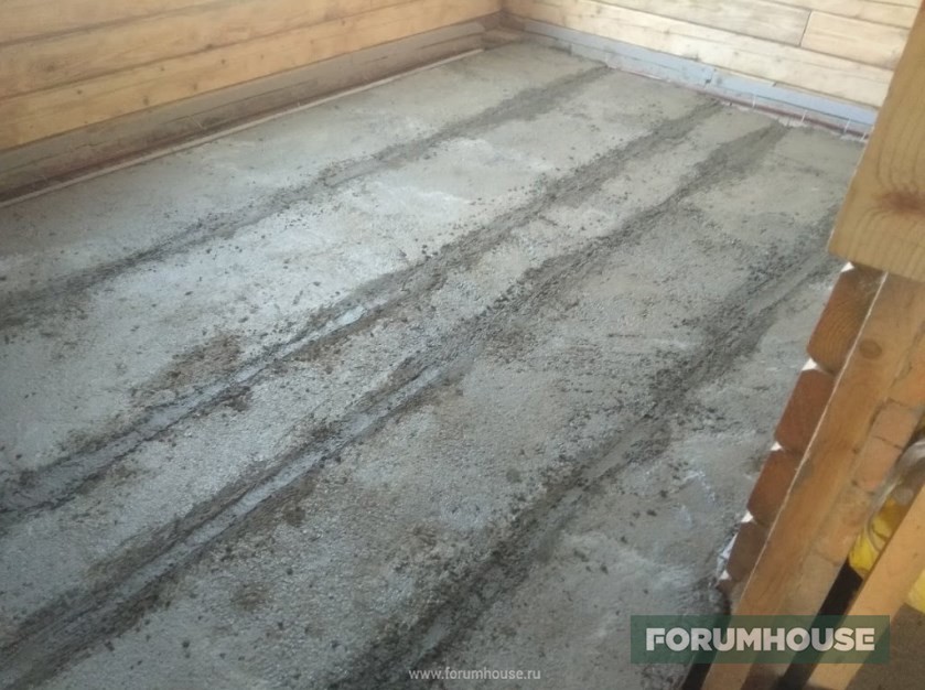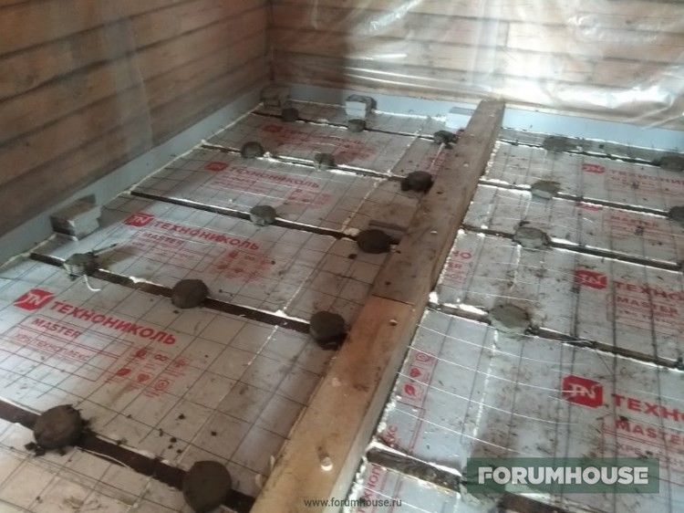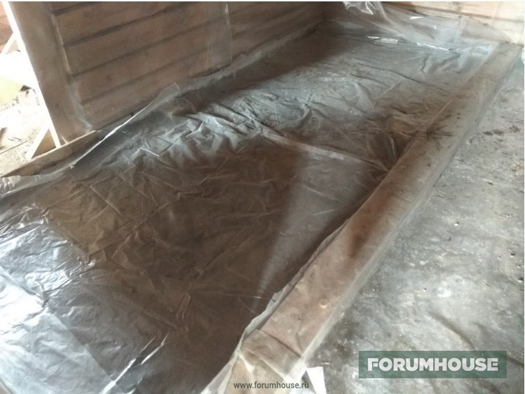 Крыша закончена, продолжил с полом – первыми под заливку самомесом пошли котельная и ванная. Для равномерной гидратации и предотвращения растрескивания, бетон укрыл пленкой.