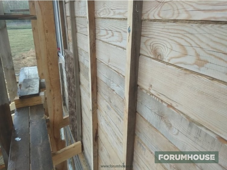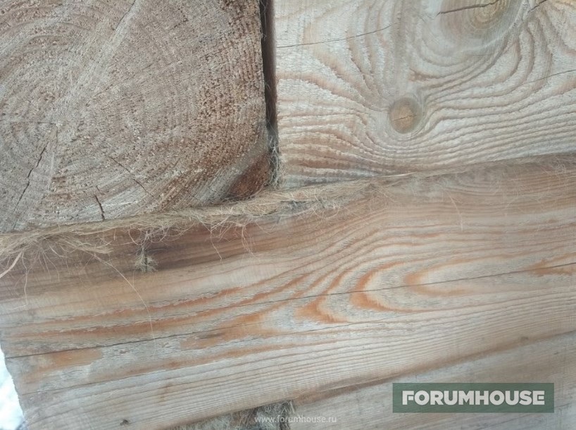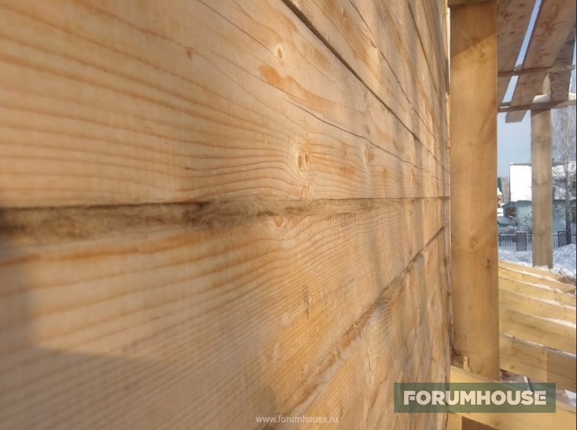 Чтобы оживший с потеплением брус не покрутило в проемах, забил рейки и через паклю, плотно, прикрутил к ним доски.
