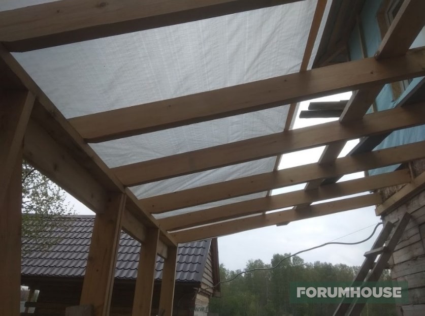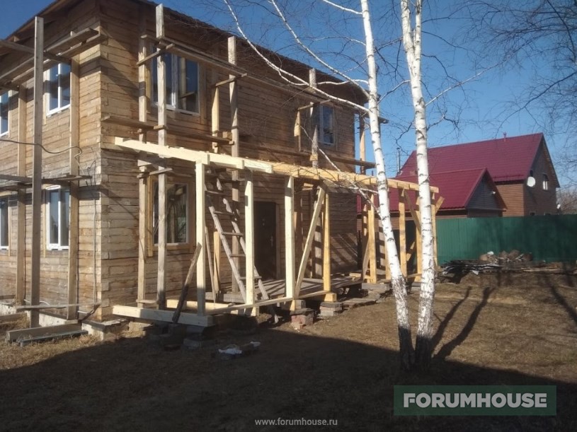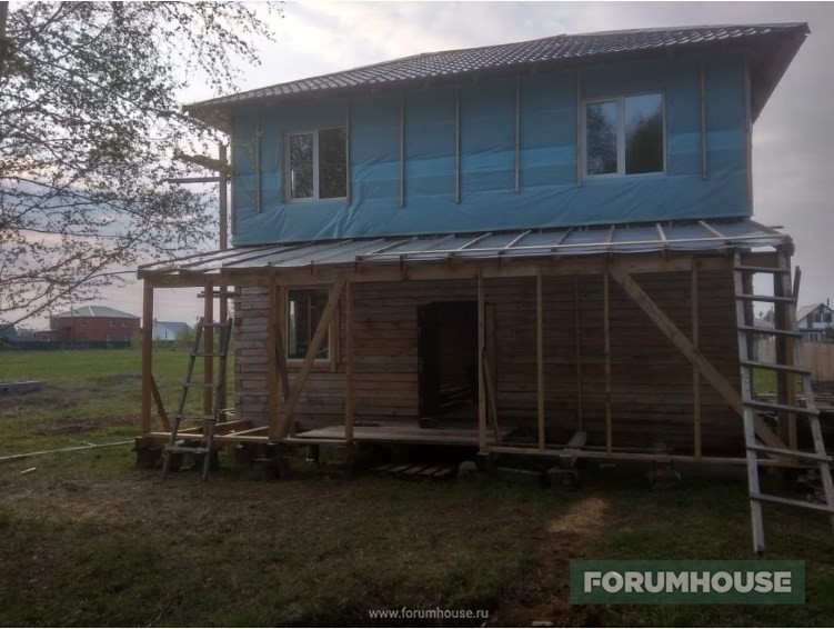Заодно и испытать утепление – пока над террасой, чтобы сразу убрать леса и закрыть крышу профнастилом, а не металлочерепицей. И визуально на пологом скате нравится больше, и снег сходит лучше.