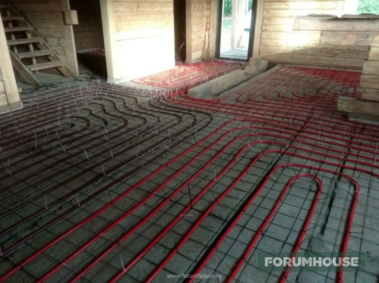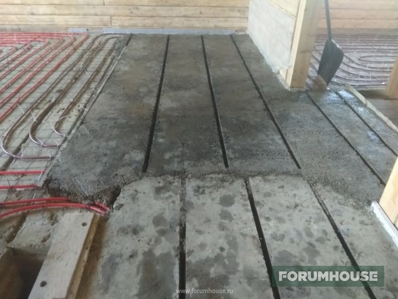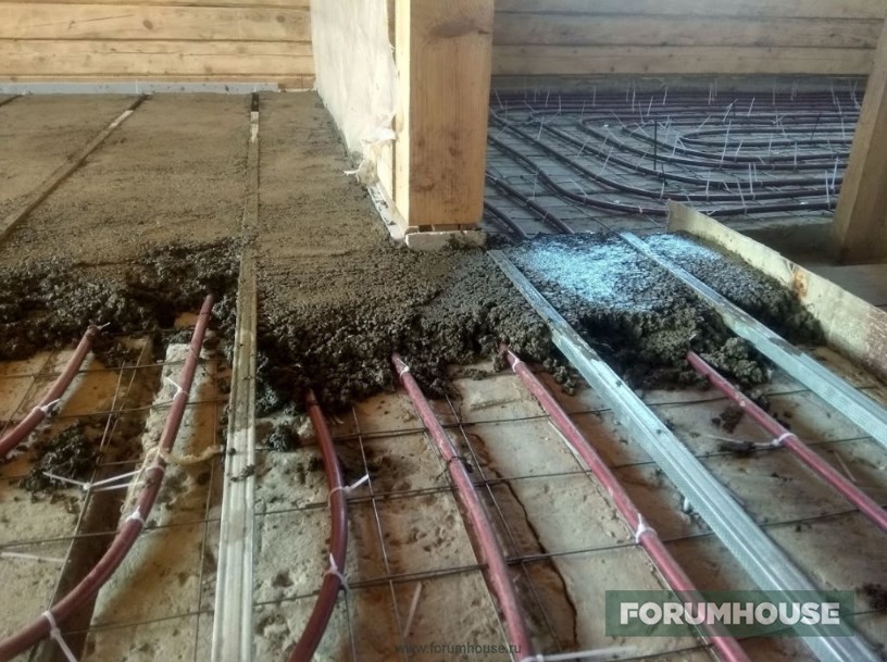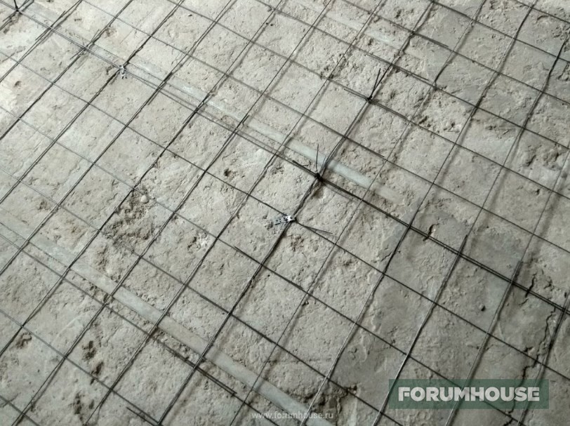 Теплый пол на первом этаже RNIS77 решил укладывать в два этапа – устройство черновой стяжки, после высыхания армирование, укладка контуров и заливка труб тяжелым бетоном с щебнем. В среднем, общая толщина получившейся плиты будет около 150 мм.