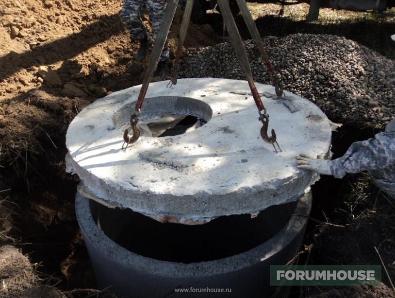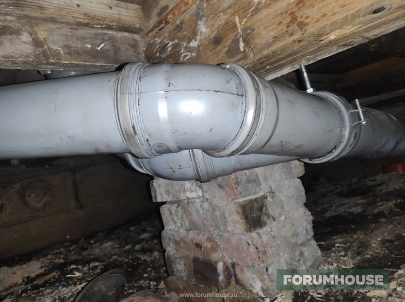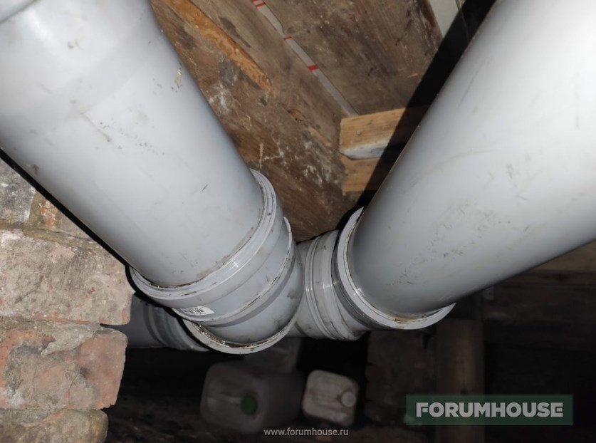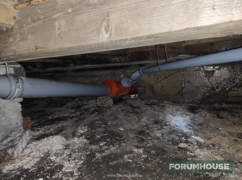 Канализация – септик на расстоянии семи метров от дома, трасса проложена рыжей трубой 160 мм, с соблюдением уклона. Внутри пришлось повозиться, условия в подполе не самые удобные.