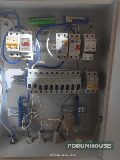 Кабеля под розетки первого этажа 2,5 кв раскиданы по полу в гофрах и успешно забетонированы. Как только стал ночевать в доме, собрал на коленке временный щит – автоматы по 25 под рукой были, поставил их (на такое сечение 25А много!). До дома идет СИП 16кв, дальше СИП коммутировал с медным ВВГ НГ LS 10кв. Из этого же кабеля наколупал провод для внутренних соединений щита, 10-ку гнуть – хоть тиски используй. Но сделал примитивный щит. Вводной автомат, реле напряжения, и УЗО. Мой внутренний перфекционист был нещадно загнан пинками в угол, ибо времени в обрез, а электрику по дому минимальную надо пустить – холодильник, кухня. Плитка пока одна конфорка на 1,5 кв.