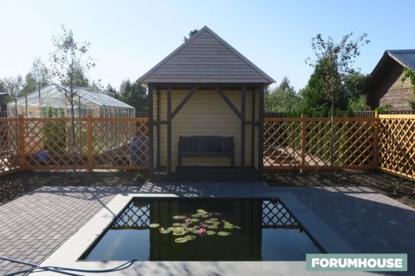 Проект по техническому заданию нашего пользователя нарисовала профессиональный ландшафтный дизайнер. Для других работ тоже привлекались специалисты: один руководил работами по мощению и установкой пруда, второй – деревянными работами в саду.