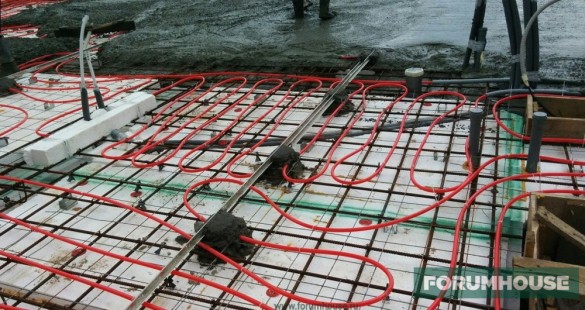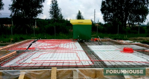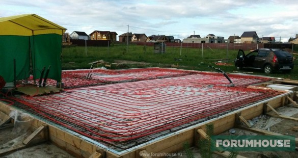 Армирование поверх слоя пенополистирола сделали усиленное – арматура Ф8, сетка с ячейкой 300×300 мм, по периметру длиной 1200 мм. В зоне над погребом перекрытие армировали арматурой 12 мм. На раскладку магистрали теплого пола в одиночку у Swift099 ушло два дня и две бухты труб из сшитого полиэтилена, каждая по 240 метров. Всего шесть контуров, длиной от 65 до 79 метров, хомуты 150×30 мм. В процессе пошли дожди, и коллектор пришлось укрыть палаткой, чтобы подключить трубы. После сборки систему опрессовал воздушным способом – пара переходников, манометр, простейший автомобильный компрессор и шланг от смесителя. Перед заливкой выставил маяки – использовал потолочный профиль для гипсокартона.