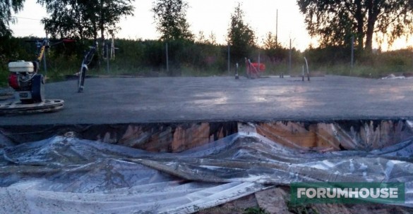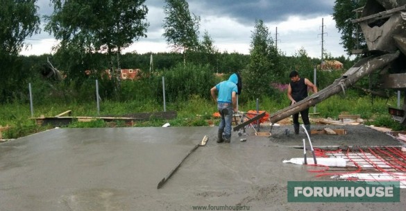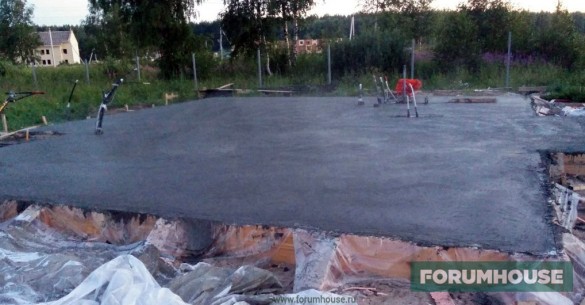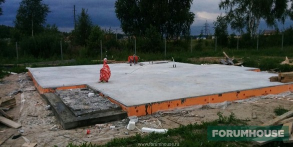 Бетон для заливки марки М350 (В25, F150) – 14 м³, благодаря свободному доступу залили непосредственно из машины, в процессе несколько раз переезжая с места на место. Крыльцо осталось недолитым, так как бетона немного не хватило, вместо ожидаемого излишка. Спустя несколько часов плиту затер «вертолетом», меняя оснастку – первым проходом – диск, завершающим – лопасти. Затертую плиту защитил пленкой.