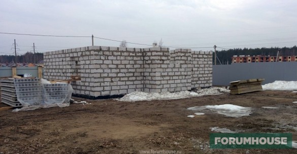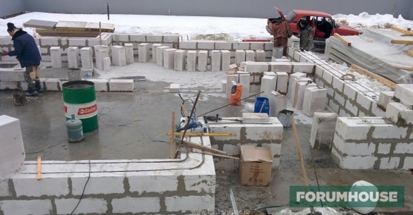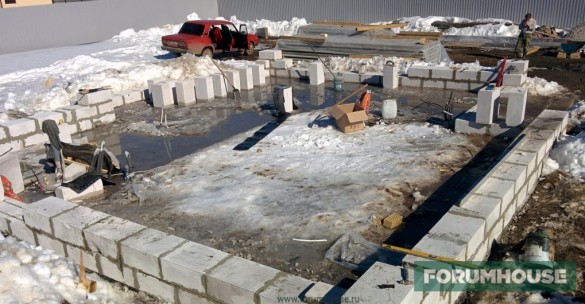 Погреб оказался очень кстати, чтобы расположить бригаду, и в конце марта стройка началась. Сначала очищали плиту от снега и льда, после укладывали блоки.