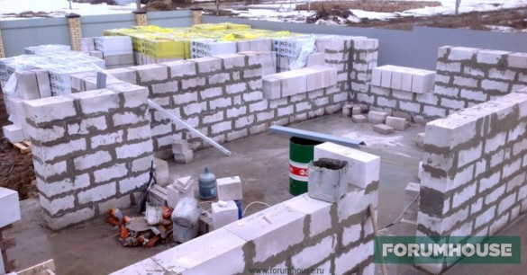 Столь мощное армирование кладки вызвано необходимостью – после пересчета конструктива фундаментной плиты с помощью опытных форумчан оказалось, что нагрузка – максимально допустимая, и необходимо усиление конструкции. При массе достоинств газобетон «славится» хрупкостью, и малейшие проблемы с фундаментом чреваты растрескиванием коробки. Поэтому решили не рисковать, а подстраховаться. Процесс стройки находился под постоянным контролем – по вечерам после работы и в выходные дни, чтобы в итоге запроектированное не отличалось от построенного, обязательна проверка соблюдения габаритов и уровня плоскостей.