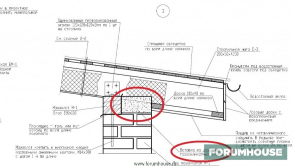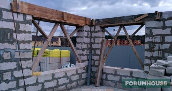 Перемычки над окнами совпали с одиннадцатым рядом, расчеты армирования, перекрытий и крыши пользователь заказывал профессионалам. Для оконного пролета 237,5 мм по четыре прута арматуры 12 мм понизу и по два поверху, через каждые 15 см – поперечины (от края через 10 см). Опалубка из доски, с фасада изоляция из ЭППС (100 мм).