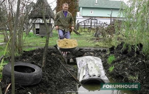Тем более, для этого нужно делать гидрогеологическое изыскание на участке, и нет гарантий, что это поможет. На все работы просто нет «лишних» денег. Поэтому Серёга567 решил вручную обнести участок подпорной стеной из б/у шин от грузовых машин, набитых песком. Затем поднять уже укреплённый участок с помощью автопокрышек и создать насыпной «остров» и, тем самым, отрезать участок от заливающей его воды.