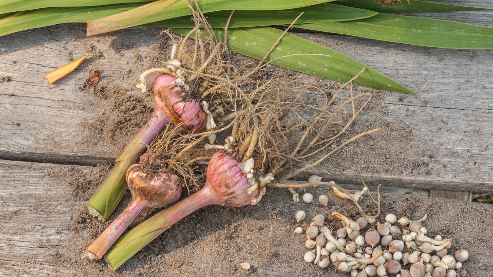 После того, как листья высохли (а если их обрезали сразу, то через 1 – 2 недели сушки) от клубнелуковиц нужно отделить деток, старые клубнелуковицы и удалить корни – после сушки они легко отрываются (сразу после выкопки отрывать все не стоит – можно повредить материнскую клубнелуковицу). И снова отправить сушиться – еще на пару недель. То есть в общей сложности клубнелуковицы должны сушиться 3 – 4 недели.