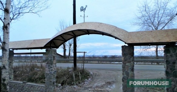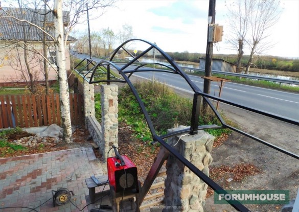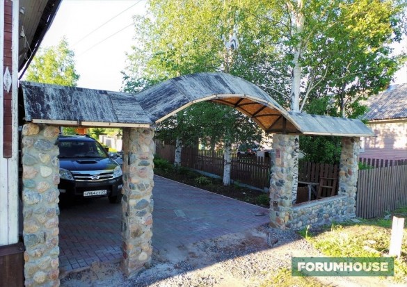 Я уже три года строю забор и натурального камня. Все силы брошены на достройку бани, но скоро дострою и забор. Концепцию видно уже сейчас. Столбы каменные. Арка из профильной трубы. Пролёты зашью деревом. Вот, что уже получилось.