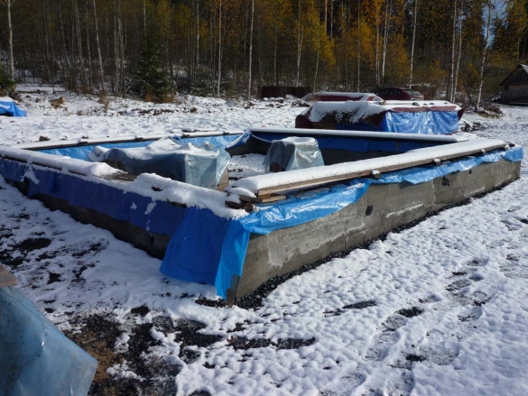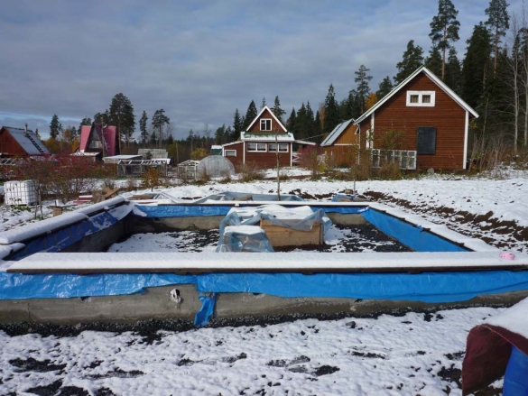 С опалубкой и разметкой пользователь нашего форума возился почти две недели. К тому времени выпал первый снег (10 октября — что привычно для Карелии) и пролежал несколько дней. Саму опалубку делали из дощатых щитов — ящиков из-под оборудования 8 м х 50см х 50см, струганных и шпунтованных досок (хозяину-прорабу удалось недорого купить материалы на работе). На этом этапе очень помог сосед.