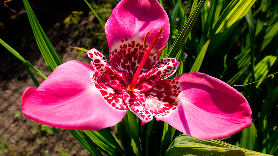 Место. Тигридия предпочитает солнечные места, защищенные от ветров – в таких условиях у нее развиваются крепкие побеги, их не придется подвязывать. И еще важно, чтобы участок не был в низине, где застаивается влага после дождей и поливов – клубнелуковицы не любят замокания.