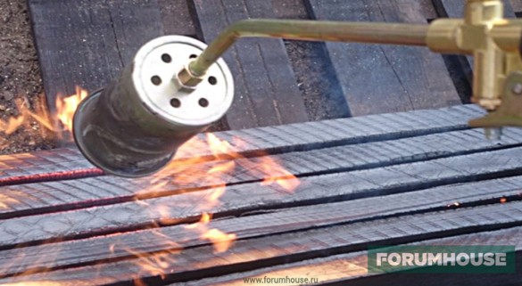 Спустя два с половиной месяца, когда доски основательно просохли, buka23 занялся обжигом с помощью балонного газа, горелки, рук и здравого смысла. За одни выходные обжег все доски для вертикали в количестве восьмидесяти штук, получилось декоративно даже без нанесения запланированной пропитки.